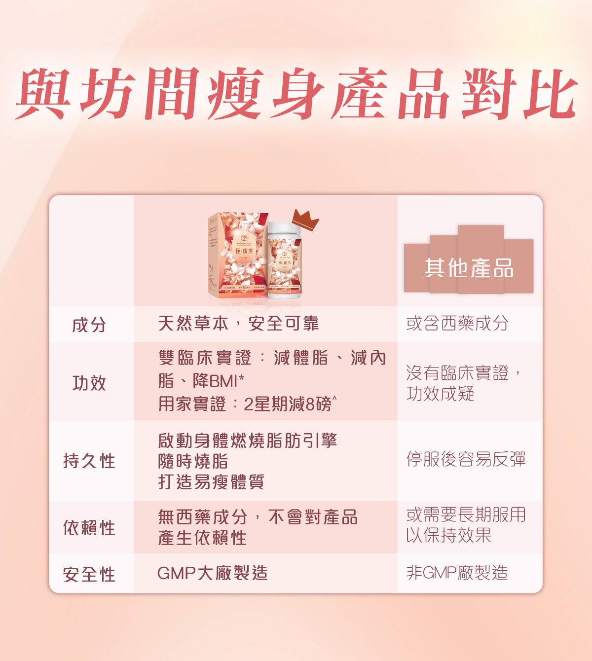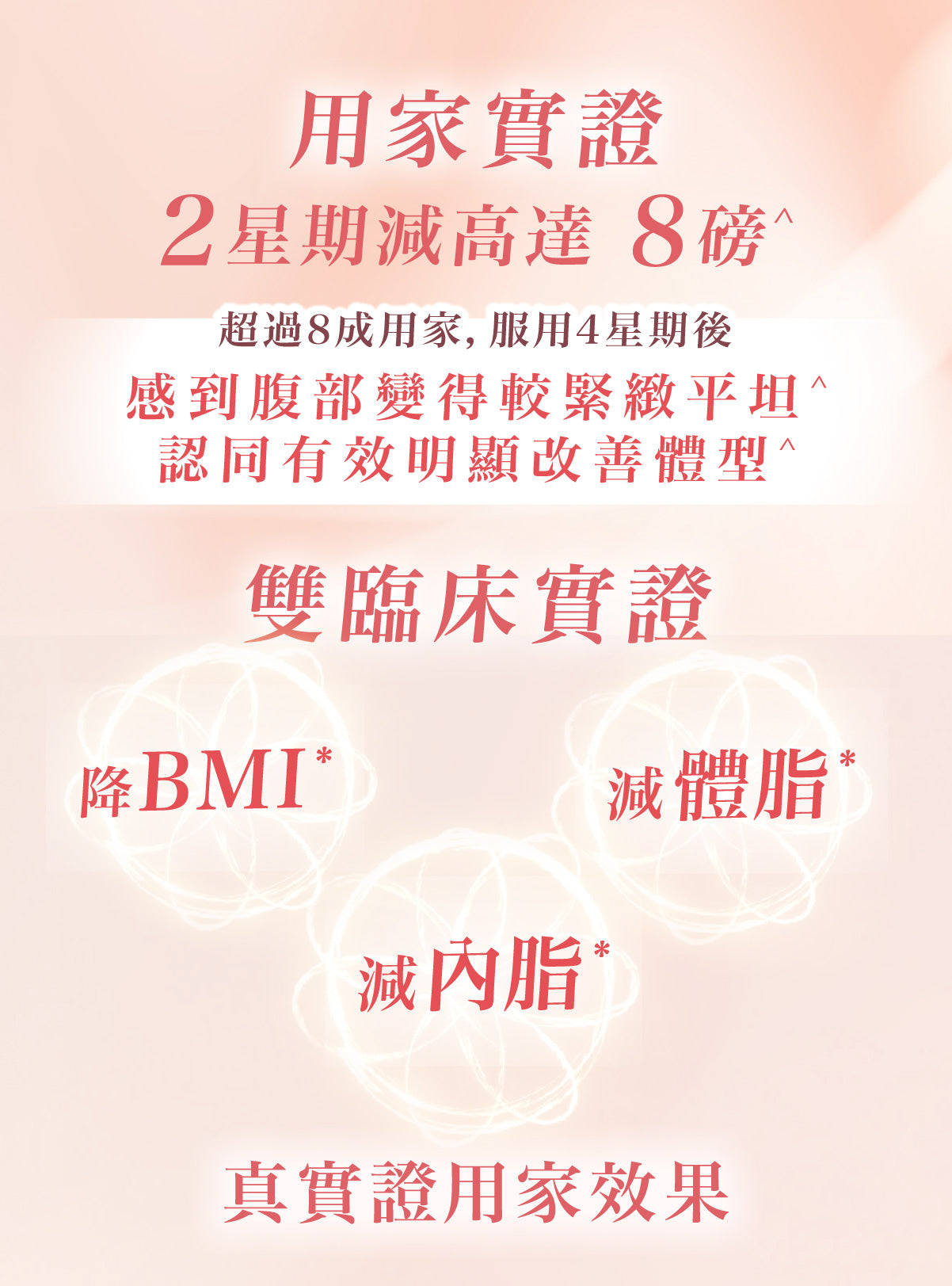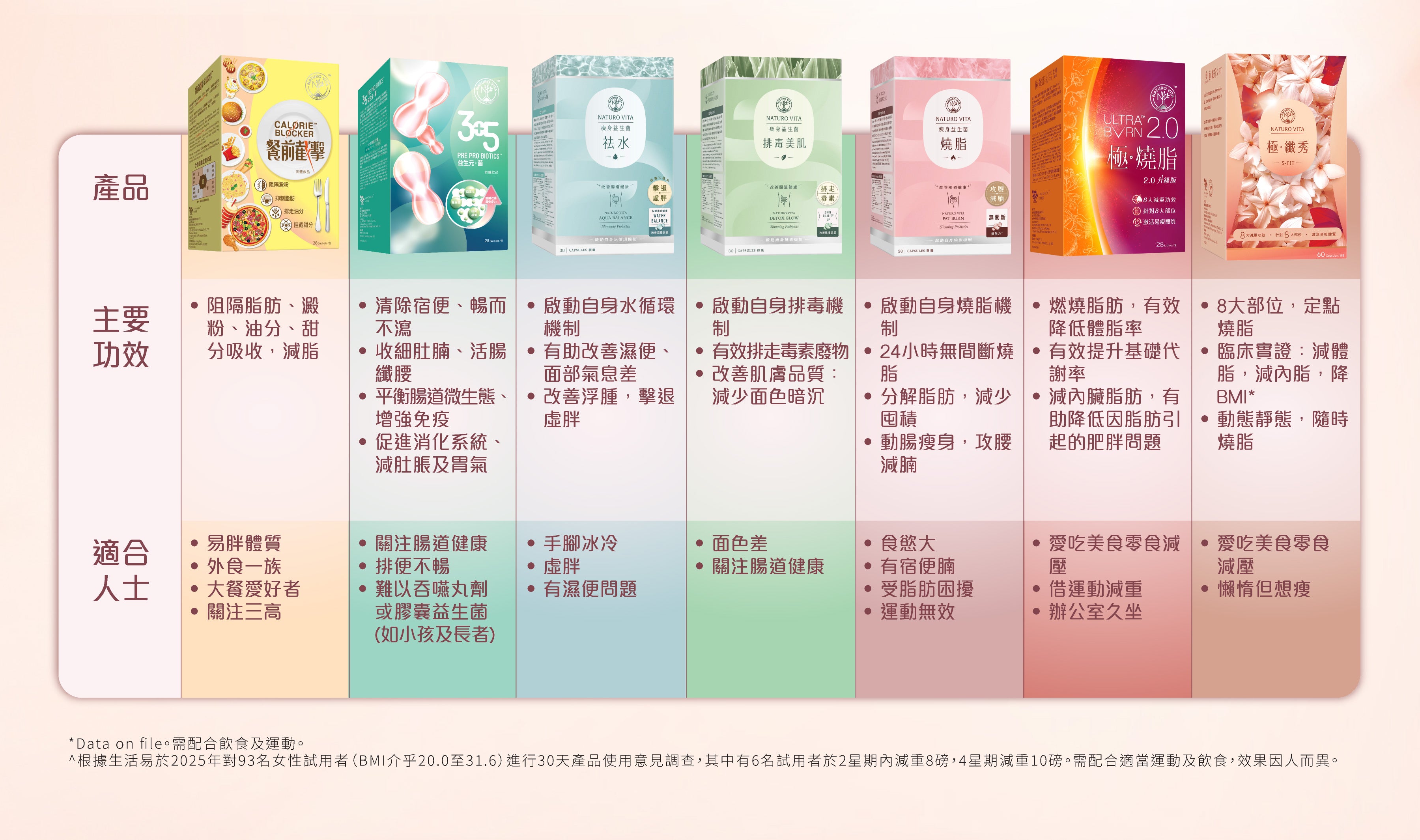 ^ 根據生活易於2025年對93名女性試用者(BMI介乎20.0至31.6)進行30天產品使用意見調查,其中有6名試用者於2星期內減重8磅,4星期減重10磅。需配合適當運動及飲食,效果因人而異。